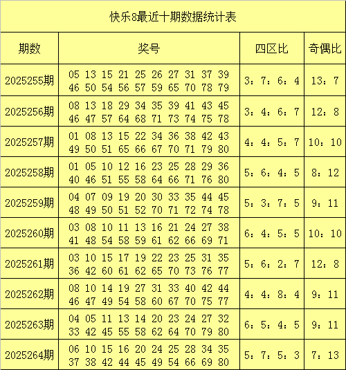 快乐8第2025264期开出奖号:06 10 15 16 20 24 25 28 34 35 37 38 42 44 45 49 54 66 69 80,其中奖号和值为737,跨度为74,012路比为8:7:5,四区比为5:7:5:3,奇偶比为7:13。